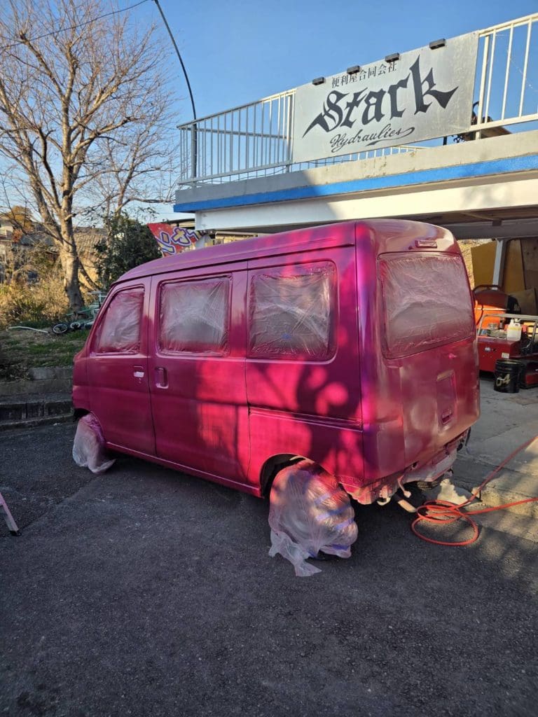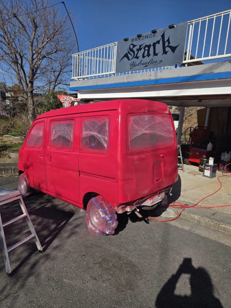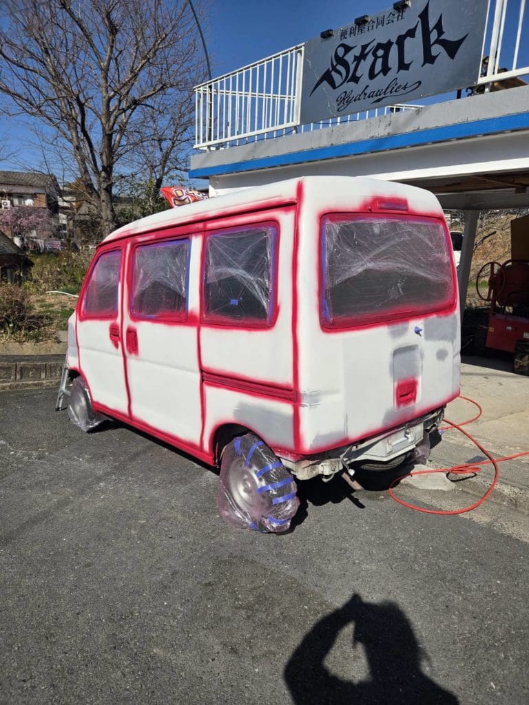 シンナー合わないせいで塗肌めちゃくちゃなりましたが、どうせまた水研ぎして模様やら看板やら入れるからOK(o^-‘)b !