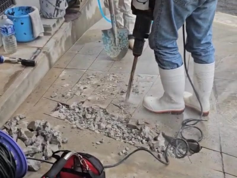 車がスムーズに入庫できるよう、車庫のコンクリートを削って高さを調整しました。動画で施工の様子をご覧いただけます!